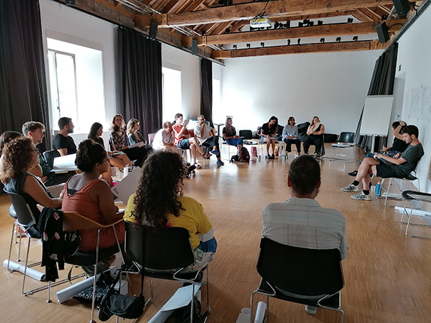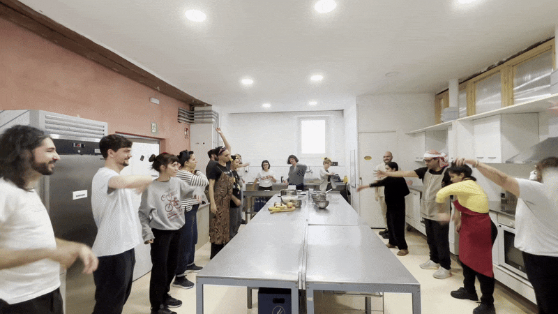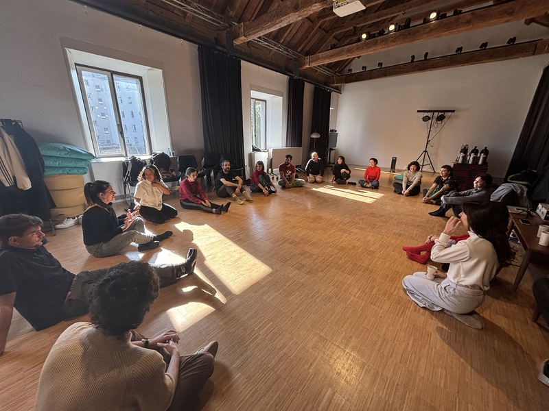 Iniciem la jornada amb una sessió de ioga a càrrec de la Carla. Estirem, respirem, ens connectem, ens acariciem: check-in des del cos. A continuació, fem una ronda d’animalitat: cadascú ha de fer un soroll d’animal, l'escena és prou divertida i, quan acabem, estem més distesos, amb els cossos desperts i els riures compartits encara ressonant a l’aire.