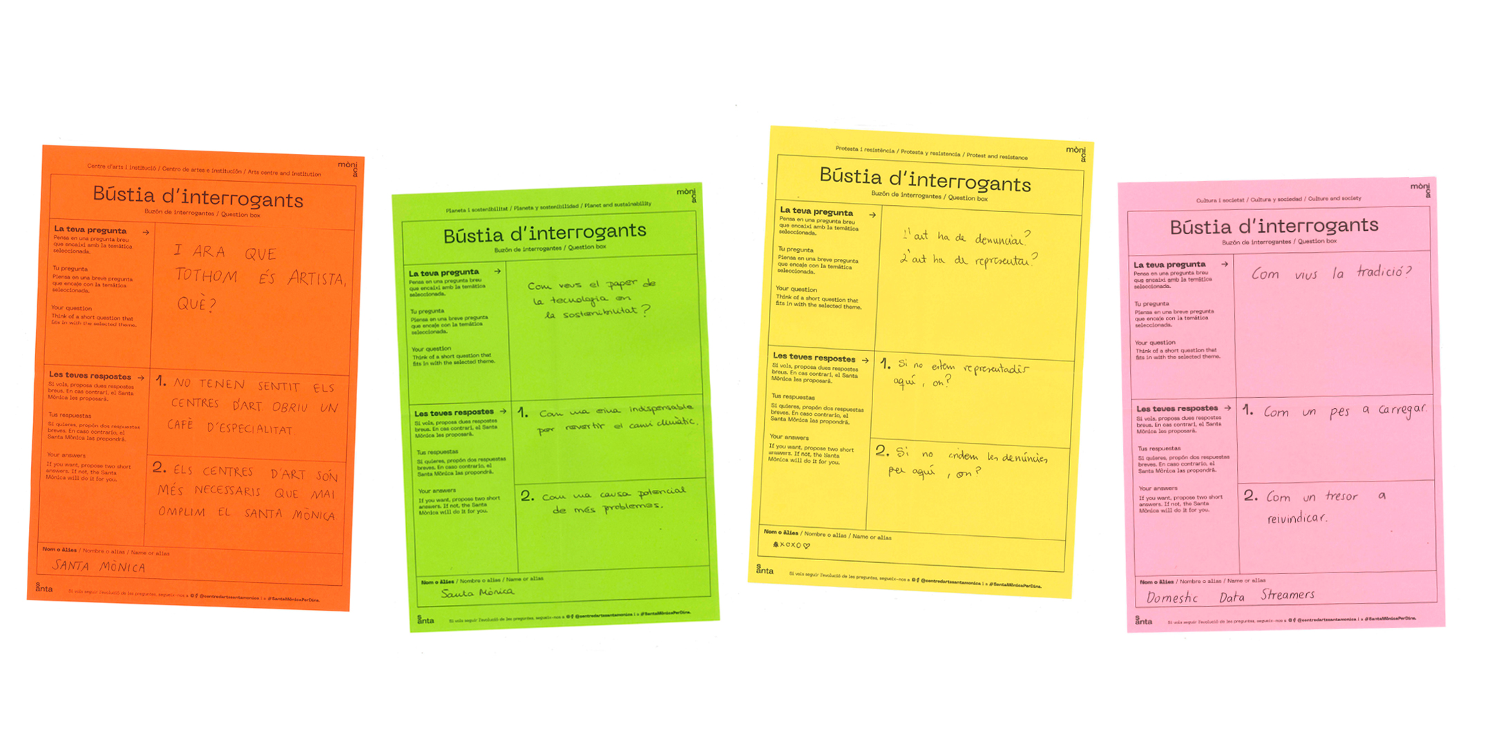 Recentment hem estrenat l’espai participatiu del hall que us avançàvem fa unes setmanes. El dispositiu de Domestic Data Streamers funciona de la següent manera: Cada setmana s'imprimeix una pregunta, obtinguda de la bústia o plantejada per part del Santa Mònica o artistes/col·lectius residents, i es plantegen dues possibles respostes. Al final de la setmana es fa un recompte de vots i s'extreu el percentatge de cada resposta.