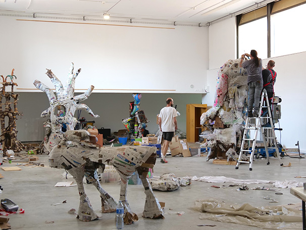 Des que es va desmuntar l'exposició L'altre costat, a partir del dia 2 de juny i fins al dia mateix de la inauguració de "Màquines del Temps", el passat dijous 27 de juny, l'artista Toni Hervàs ha estat treballant incansablement en la creació de les seves escultures, i el muntatge i distribució de les peces dels altres artistes, que conformen un maremàgnum cromàtic d'intensitats i anhels. L'elaboració de les seves escultures l'ha dut a terme al mateix espai on ara es troben, i des del Santa Mònica hem pogut presenciar aquest procés únic.