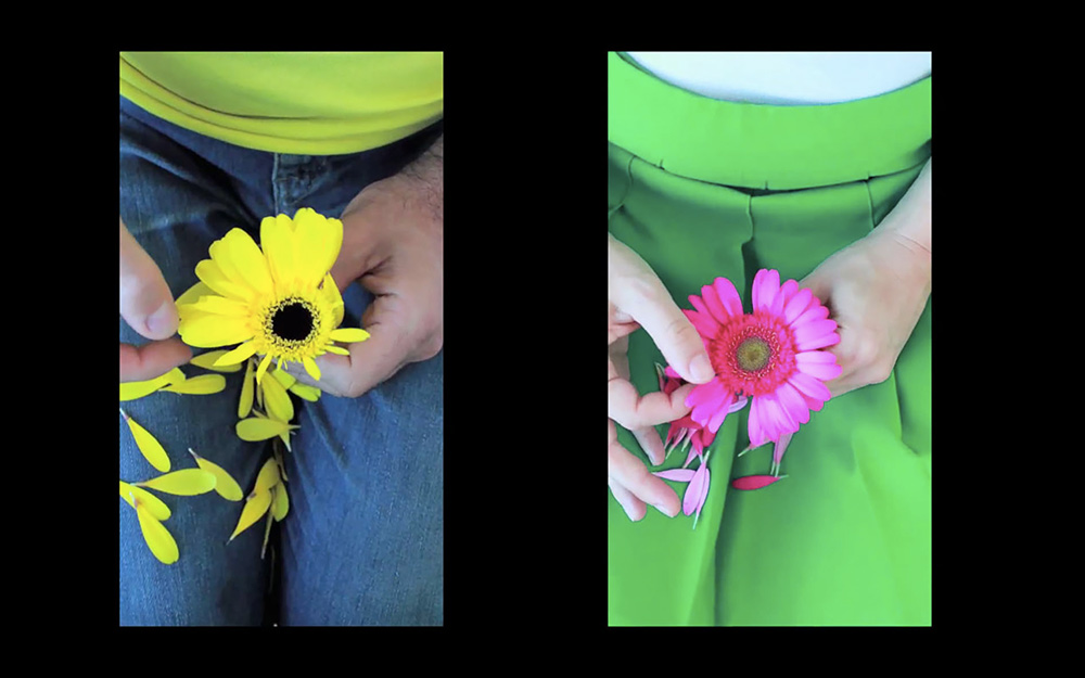 La exposición está formada por la selección de 3 videos/artistas. El primero del artista Deborah Engel, títulado Devir donde se ve a dos personas sacando pétalos de flores como casi un juego infantil para saber si el otro le ama. De una manera, parece que es obvio la identidad de un hombre y una mujer que tienen colores distintos cada uno sacando sus respectivos pétalos. Flores iguales de colores distintos, así como las personas. En ese preciso momento realizan el mismo acto y podrían cambiarse de colores y flores o de ubicación. Pero cada uno en su imaginario crea una realidad, un deseo, una voluntad de resultado para ese juego que finalmente termina igual que al principio, sin que sepamos que pasó dentro de sus cabezas, un territorio de abstracción mental de cada uno y el resultado logrado o no.