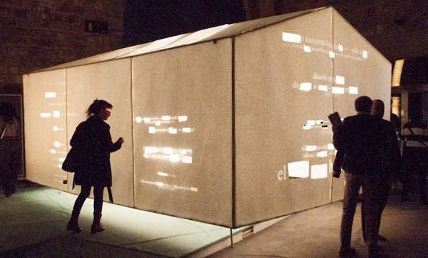 En este vaciarse, que es físico, el texto se rehace una y otra vez, entregándose a los participantes, liberándose de las paredes que lo contienen y lo hace visible. A medida que desaparecen las palabras, aparecen nuevos poemas, que acababan desapareciendo para dejar aparecer otros nuevos… La palabra – luz, atrapada en el papel, se borra de su soporte físico para perderse en el espacio (proyectándose por las paredes, muebles y asistentes dentro de la sala) y el tiempo. Durante la performance, algunos de los poetas participantes leerán poemas de Joan Brossa.